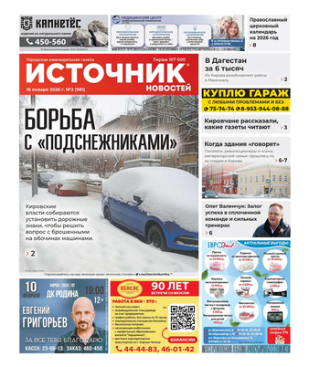 Еженедельная газета «Источник новостей» – одно из самых популярных изданий в Кировской области. Основные темы: информация о событиях в регионе, политика, культура, социальные проблемы и многое другое. В 2022 году газета признана «СМИ года» в Кировской области. Еженедельник рассчитан на широкий круг читателей.