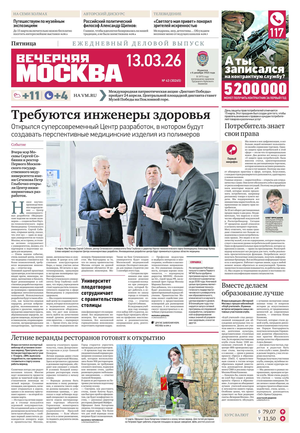 «Вечерняя Москва» — ежедневная российская вечерняя газета, старейшее из вечерних изданий в России, учрежденное в 1923 году. Выходит пять дней в неделю, кроме субботы и воскресенья. Отличается тем, что рассказывает о событиях еще не завершившегося дня. Оперативно освещает хронику и особенности жизни Москвы, охватывает все слои общества и большинство профессиональных и возрастных групп читателей.Издание представлено тремя выпусками – утренним ежедневным, вечерним (выходит три раза в неделю), еженедельным (выходит по четвергам).