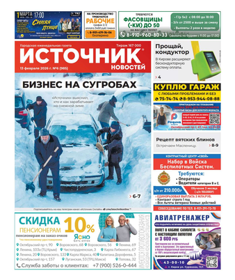 Еженедельная газета «Источник новостей» – одно из самых популярных изданий в Кировской области. Основные темы: информация о событиях в регионе, политика, культура, социальные проблемы и многое другое. В 2022 году газета признана «СМИ года» в Кировской области. Еженедельник рассчитан на широкий круг читателей.