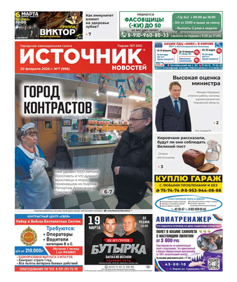 Еженедельная газета «Источник новостей» – одно из самых популярных изданий в Кировской области. Основные темы: информация о событиях в регионе, политика, культура, социальные проблемы и многое другое. В 2022 году газета признана «СМИ года» в Кировской области. Еженедельник рассчитан на широкий круг читателей.