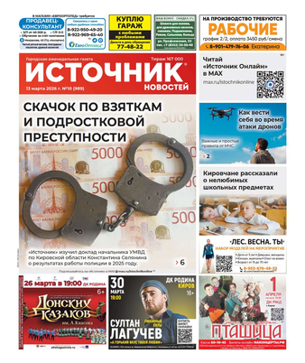 Еженедельная газета «Источник новостей» – одно из самых популярных изданий в Кировской области. Основные темы: информация о событиях в регионе, политика, культура, социальные проблемы и многое другое. В 2022 году газета признана «СМИ года» в Кировской области. Еженедельник рассчитан на широкий круг читателей.