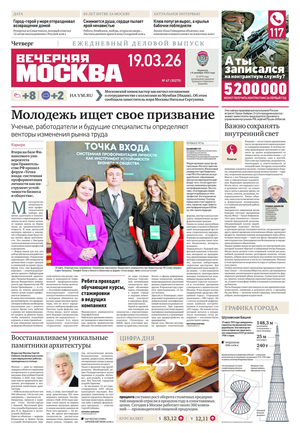 «Вечерняя Москва» — ежедневная российская вечерняя газета, старейшее из вечерних изданий в России, учрежденное в 1923 году. Выходит пять дней в неделю, кроме субботы и воскресенья. Отличается тем, что рассказывает о событиях еще не завершившегося дня. Оперативно освещает хронику и особенности жизни Москвы, охватывает все слои общества и большинство профессиональных и возрастных групп читателей.Издание представлено тремя выпусками – утренним ежедневным, вечерним (выходит три раза в неделю), еженедельным (выходит по четвергам).