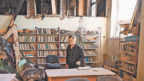 В библиотеке на втором этаже обвалился потолок и стены, сломаны столы и часть книжных стеллажей. Разрушений на первом этаже меньше, но ему тоже досталось от последствий пожара. Пол усыпан осколками, внутри все залито водой.